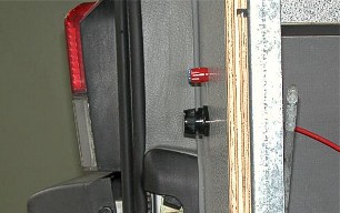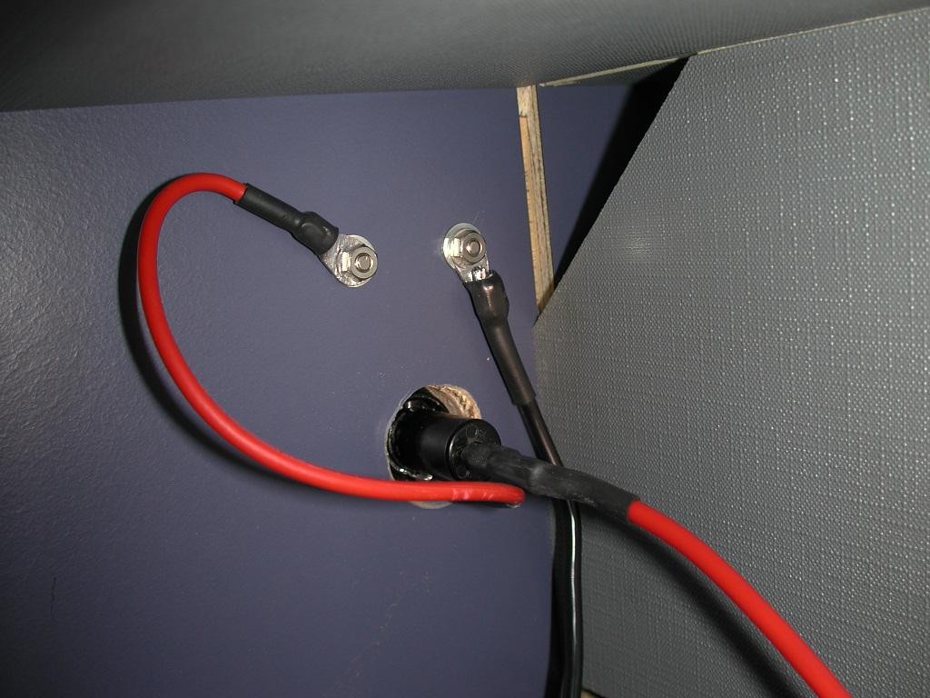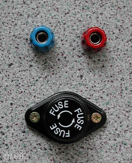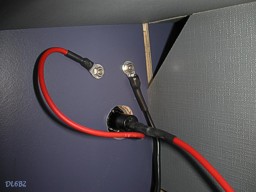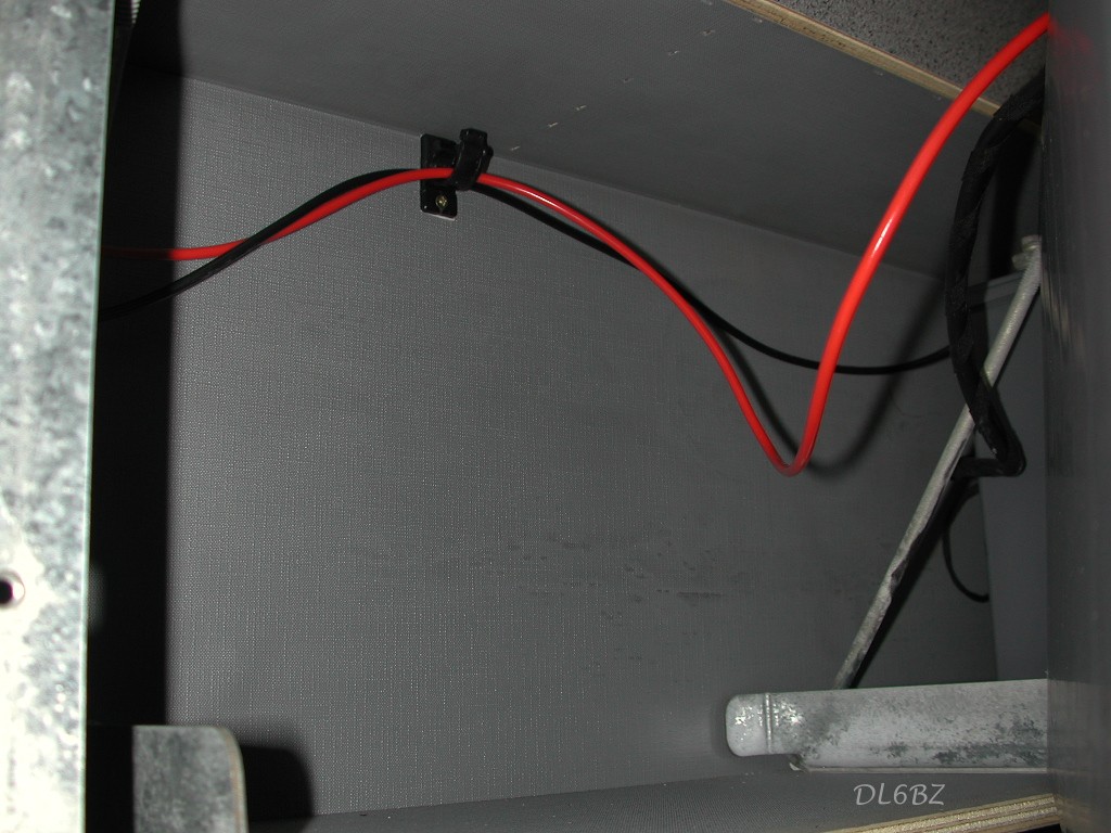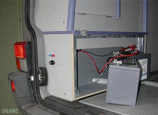 Mein Funkgerät benötigt um die 20A bei Volllast. Ein solcher Anschluss ist üblicherweise in PKW oder Campingmobilen nicht vorhanden. Der Zigarettenanzünder reicht nicht aus, üblicherweise ist er nur bis 6A belastbar. Also musste ein passender Anschluss her. Bei dem VW T4 California Tour sind hinten links zwei Batterien für den "Wohnbereich" untergebracht. Diese Stromversorgung ist unabhängig von der Hauptbatterie im Motorraum. Die Aufladung erfolgt aber über die Lichtmaschine. Den neuen Anschluss irgendwo passend in den Innenraum zu montieren, war zu viel Arbeit. Statt dessen haben wir den Anschluss unmittelbar im Batteriekasten angebracht. So hat man bei offener Heckklappe direkten Zugriff. Auch bei geschlossener Heckklappe passen die Bananenstecker noch, allerdings wird das Kabel schon arg gebogen (sprich leicht gequetscht). Winkelstecker (gibt es die überhaupt?) wären sicherlich vorzuziehen.