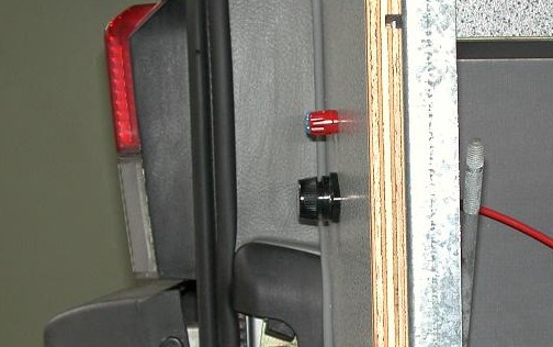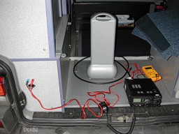 Das linke Bild zeigt den ersten Funktionstest des Funkgerätes am Dummyload RD 010/50 (Rhode & Schwarz, graues Metallgehäuse). Ich danke Bernd, dem Besitzer des Busses, für die Einbauerlaubnis. Dafür besitzt er jetzt aber auch eine "Powersteckdose", an die problemlos ein 12V-Kompressor oder ein Suchscheinwerfer angeschlossen werden kann.