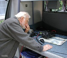 Erster Praxistest am Heimat QTH Uelsen. Die Station kann praktischerweise auf der hinteren Ablage aufgebaut werden. Das Bild zeigt meinen Vater, der einem QSO auf dem 80m-Band zuhört. |